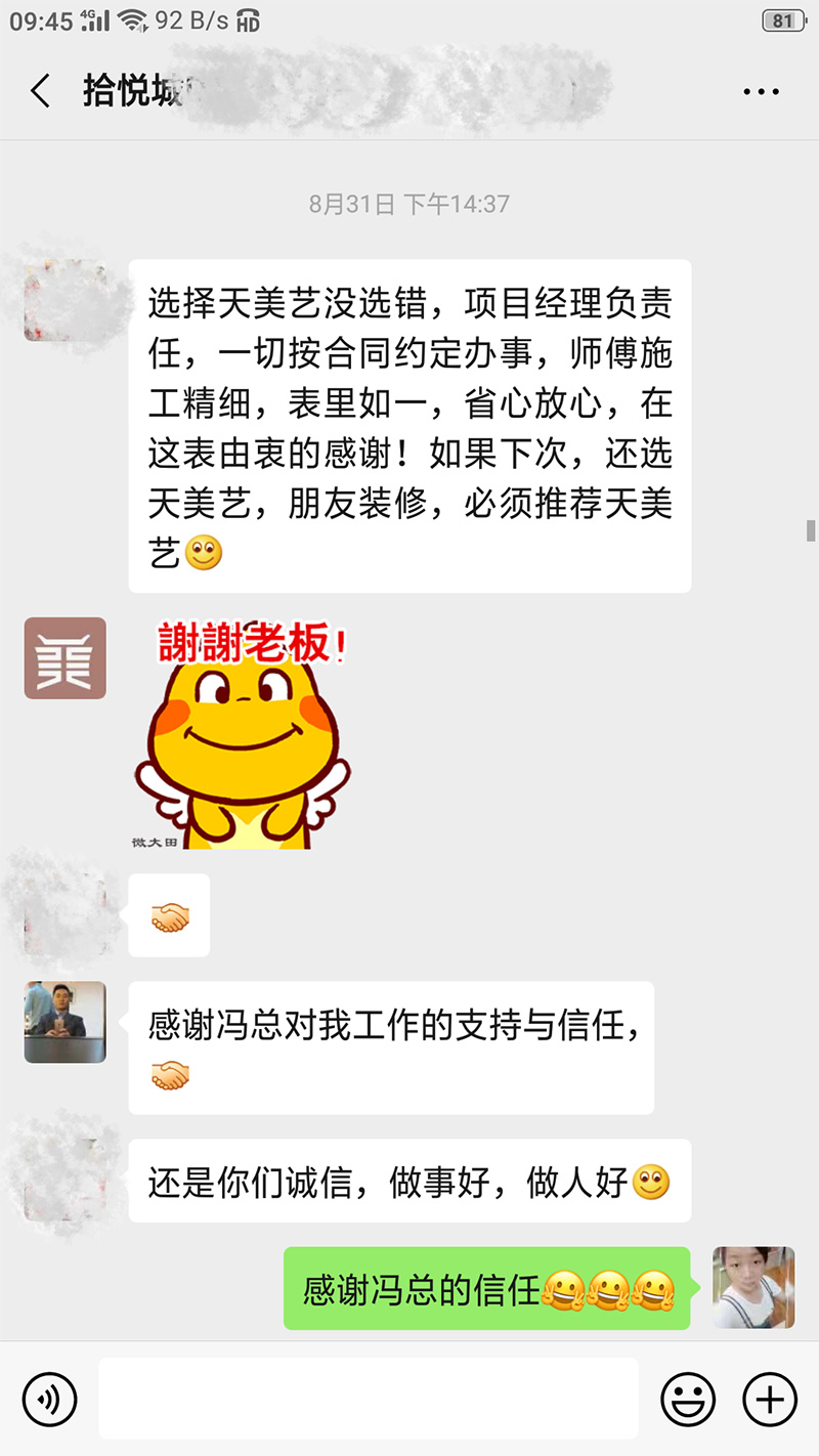 選擇天美藝沒(méi)選錯(cuò),項(xiàng)目經(jīng)理負(fù)責(zé)任,一切按合同約定辦事,師傅施工精細(xì),表里如一,省心放心,在這表由衷的感謝!如果下次,還選天美藝,朋友裝修,必須推薦天美藝。