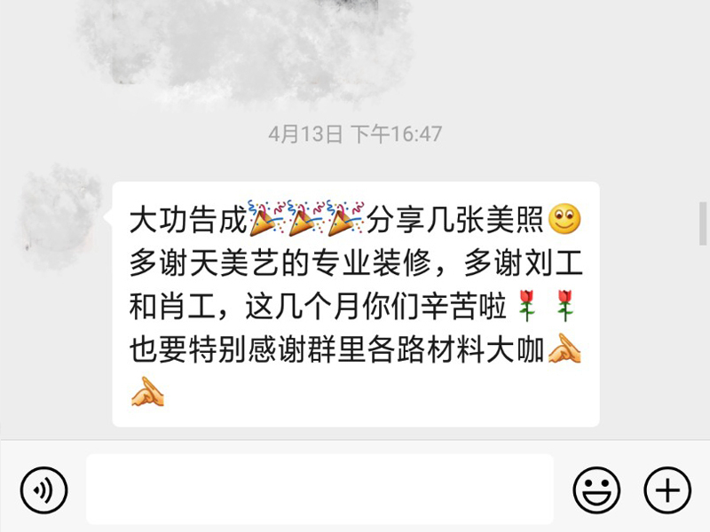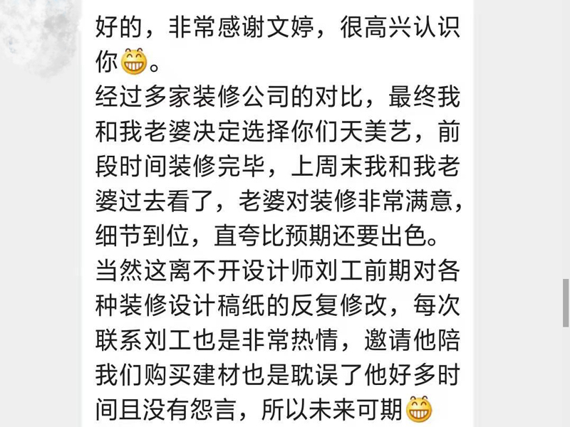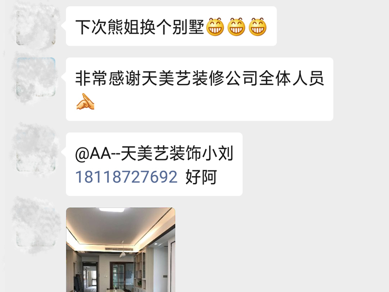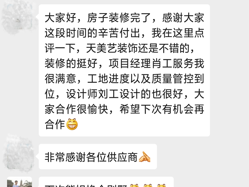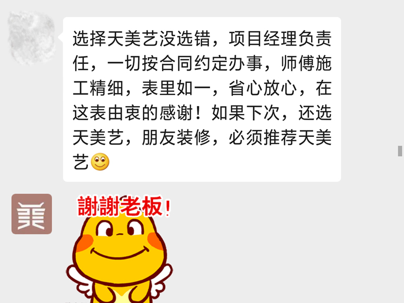 大家好,房子裝修完了,感謝大家這段時間的辛苦付出,我在這里點(diǎn)評一下,天美藝裝飾還是不錯的,裝修的挺好,項(xiàng)目經(jīng)理肖工服務(wù)我很滿意,工地進(jìn)度以及質(zhì)量管控到位,設(shè)計(jì)師劉工設(shè)計(jì)的也很好,大家合作很愉快,希望下次有機(jī)會再合作,非常感謝天美藝裝修公司全體人員。