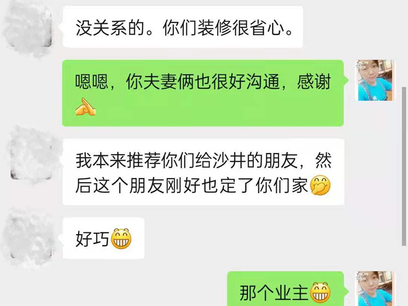 你們裝修很省心,本來推薦你們給沙井的朋友,然后這個朋友剛好就定了你們家,好巧。