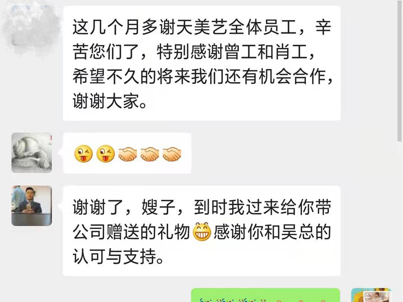 這幾個月多謝天美藝全體員工,辛苦您們了,特別感謝曾工和肖工,希望不久的將來我們還有機(jī)會合作,謝謝大家。